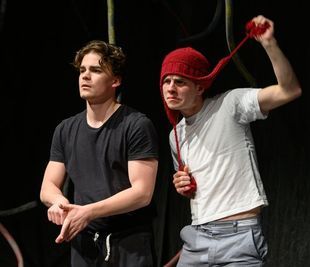 A Ruszt József Stúdió Színház terében fehér lepedők előtt, kissé megkopott, színes, vékony műanyag csövek lógnak le a plafonról – egy beazonosíthatatlan tér, amiben a színészek játéka teremti meg a váltakozó helyszíneket. A csapat a szakmai beszélgetésen elmesélte, hogy kissé ki akartak lépni Brook üres, fekete teréből, és valami színesben dolgozni.