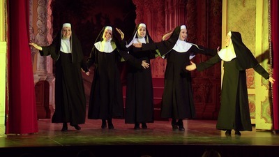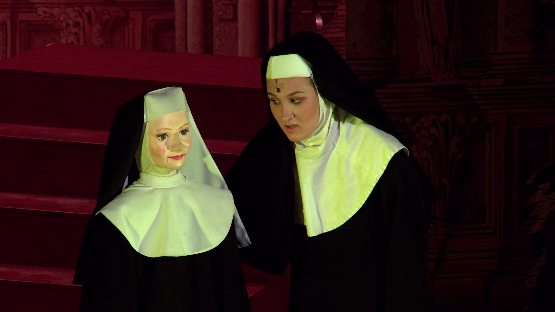 Az „apáca-show” alatt Géczi Olívia koreográfiája hol észrevétlenül beépül a nagy egészbe, hol kimondottan önmagára vonja a figyelmet. És ez igen nagy kihívás, ha az öt földig érő fekete habitusban mozgó színművészre gondolunk. Azáltal, hogy a lányoknak csupán arcuk, valamint kezük villan ki, rá vannak kényszerítve, hogy szerepeiket mimikájukkal és hangjukkal töltsék meg élettel. Majd Cserháthy Gergely nagyobb lélekszámmal dolgozó koreográfiája elnagyoltságával mozgalmasan kitölti a teret, kellemes összképet produkálva. A jelmezek is már sokkal színesebbek többet megmutatva a bennük játszók mozgáskultúrájából.